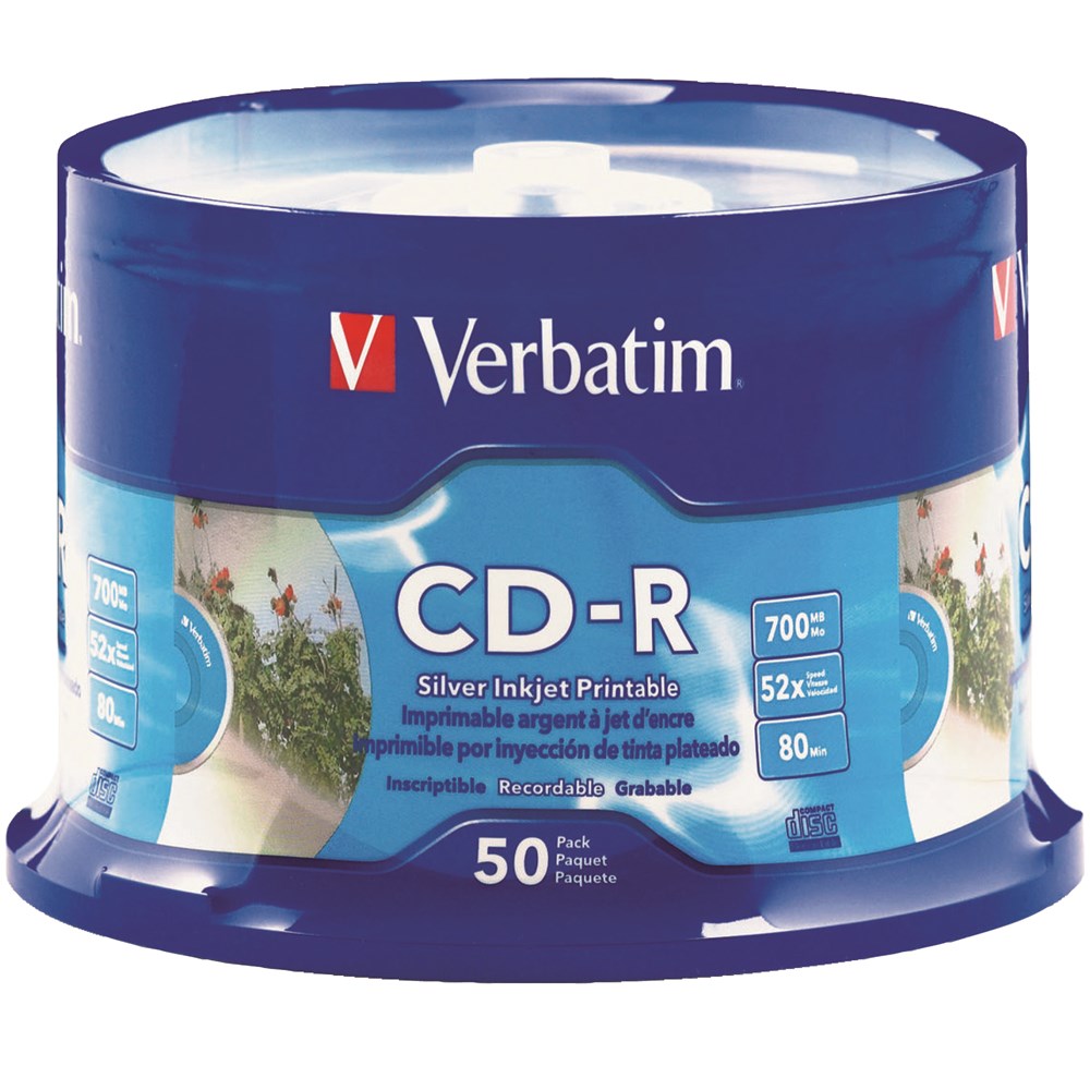 Verbatim Recordable CD-R 80Min 700MB 52X Inkjet Printable Pack Of 50 Silver