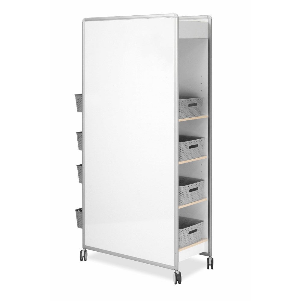 Easily movable double sided magnetic whiteboard with storage that is split into two making it perfect for shared and adaptable learning environments.