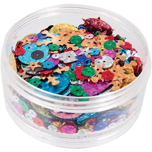 A range of brightly coloured sequins in assorted shapes and sizes ? the perfect selection for your classroom.
